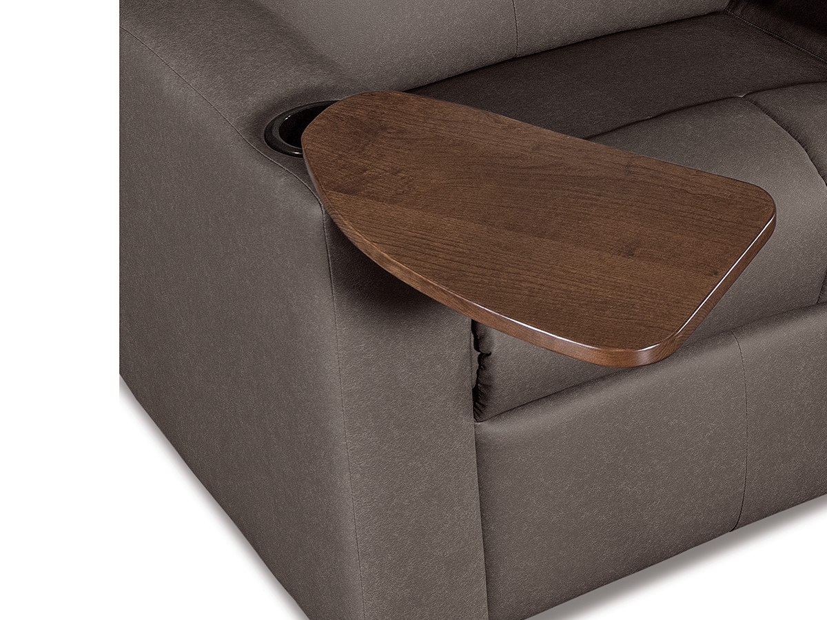 Standard features include cupholders, USB charging station, storage area under armrest and (mocha cherry) center table that stores in drawer.